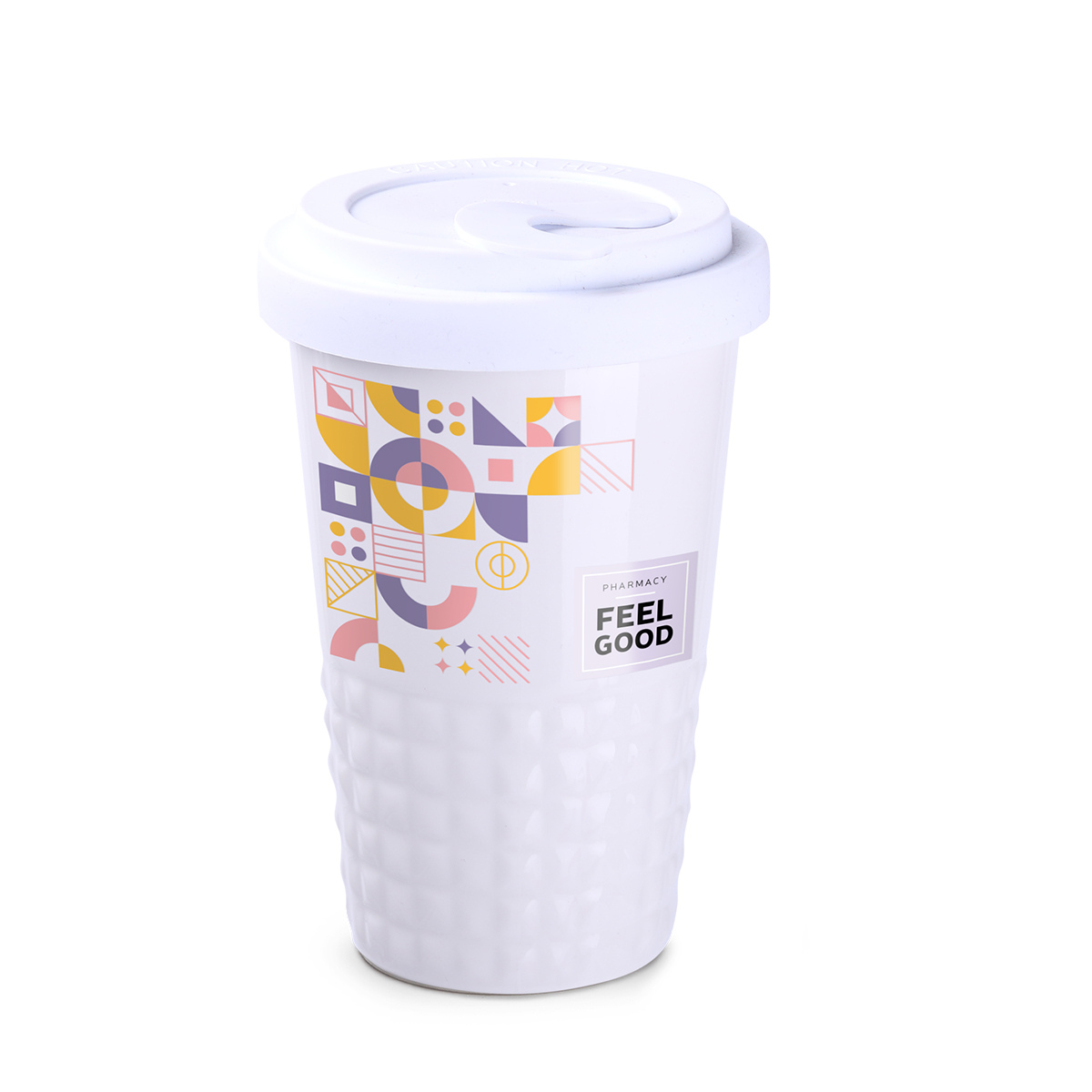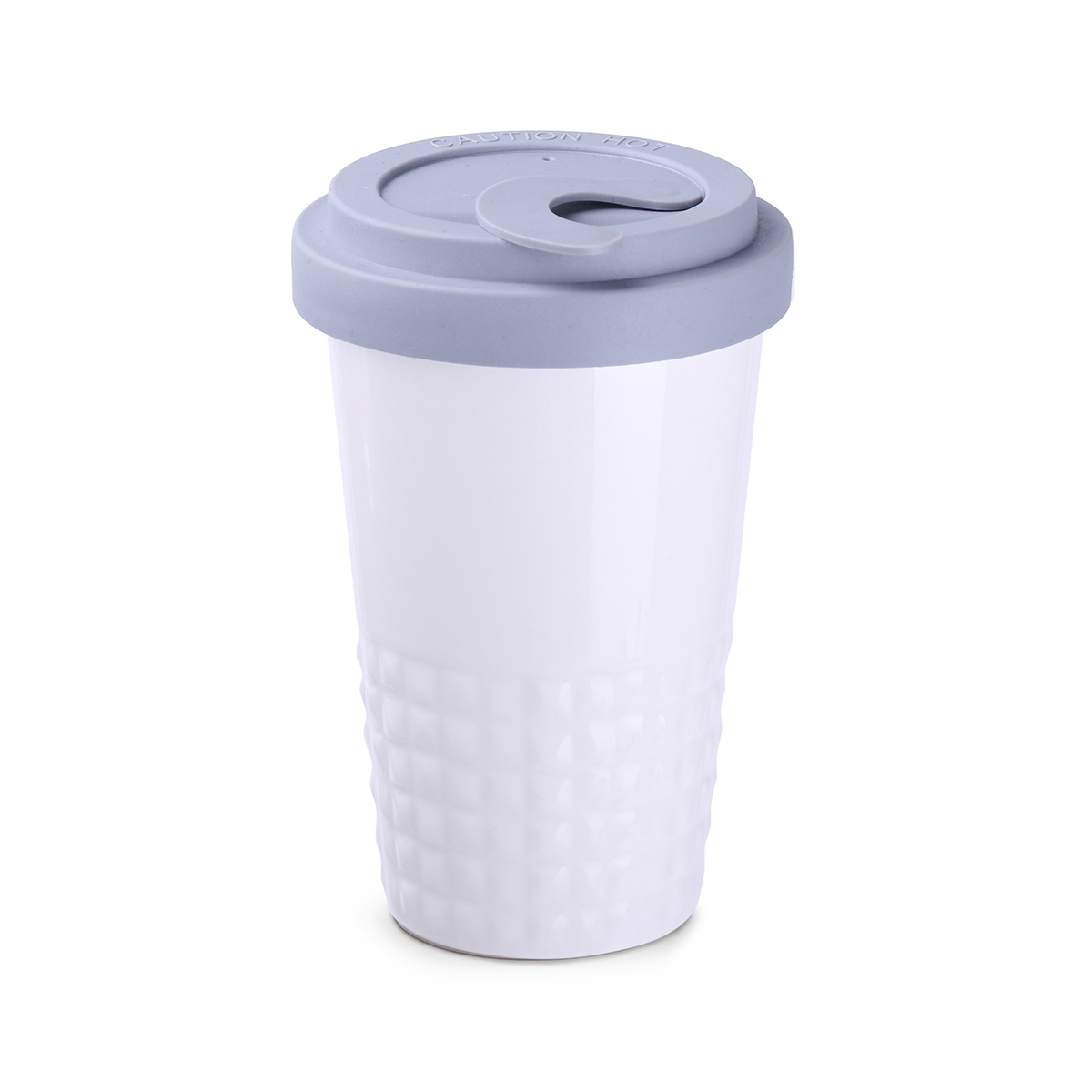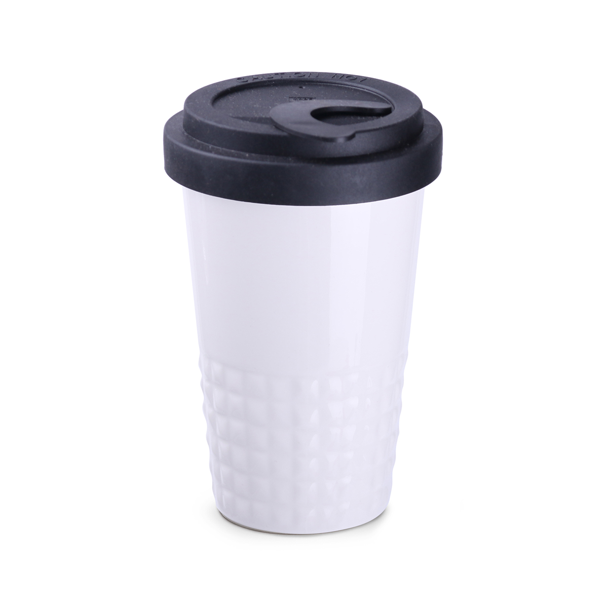 Raffiniertes Design durch symmetrisch-erhabene Form im unteren Bereich des Bechers. Doppelwandiges Porzellan mit perfekter Isolationsfunktion und dicht abschließendem Deckel.